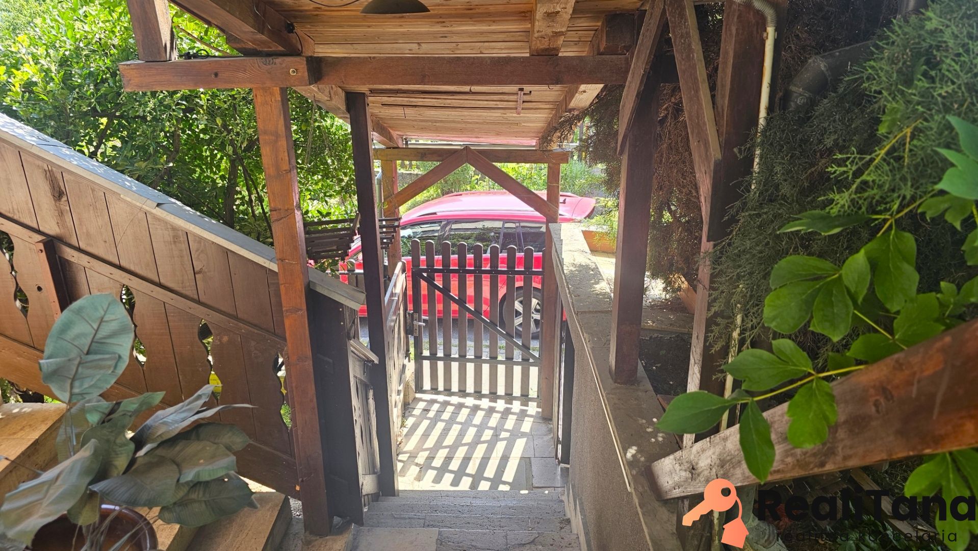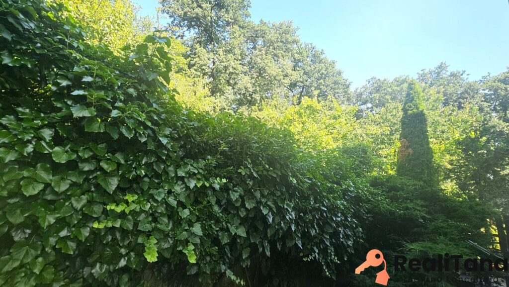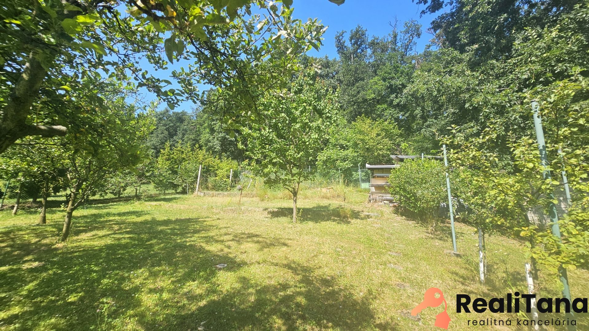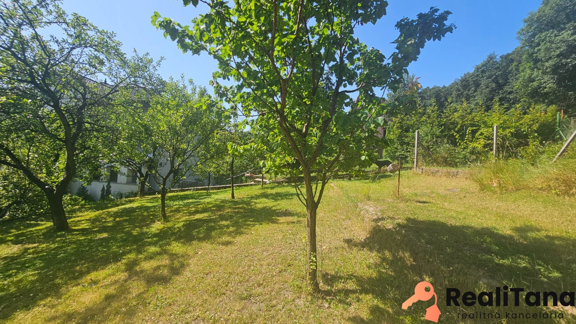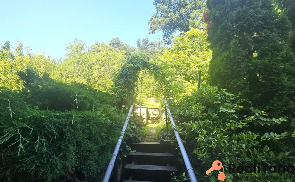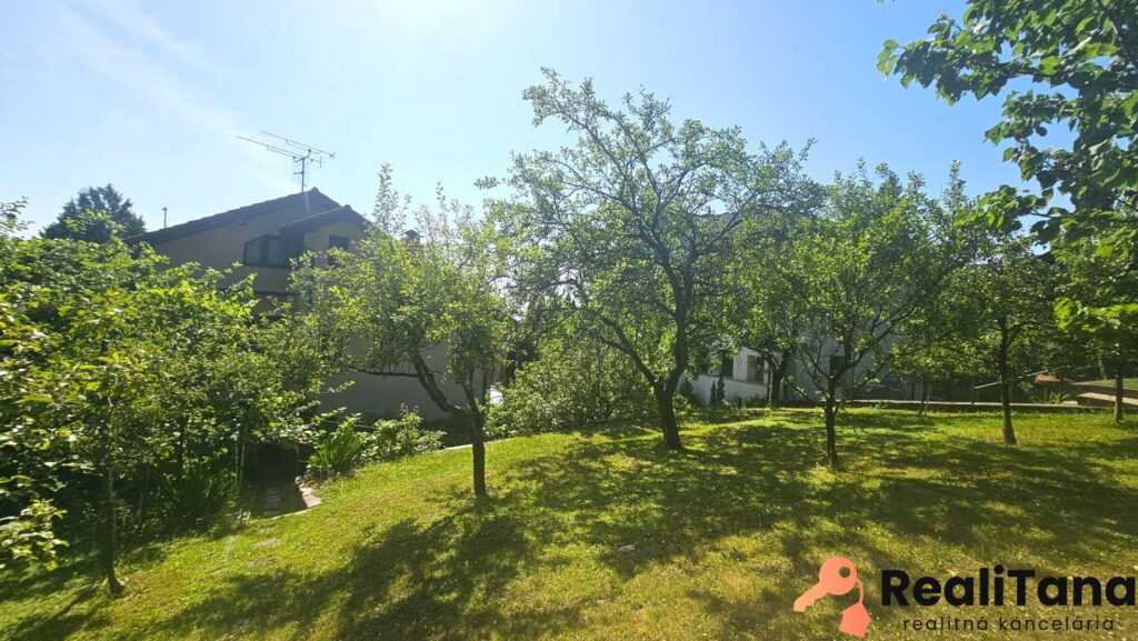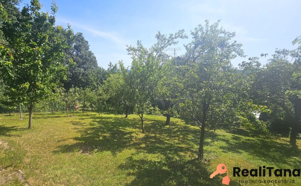 Pozemok je sčasti svahovitý, na konci záhrady sa nachádza kôlňa, dreváreň a bránka s východom do lesa. V záhrade je veľa ovocných stromov a kríkov, ako slivka, ringlota, broskyňa, višňa, černice, základy bývalého skleníka, ozdobné kríky. Z boku domu, pri terase s markízou a grilom, nájdete prekrytý bazén s filtráciou.