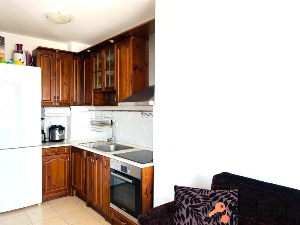 Apartmán pozostáva zo vstupnej chodby, obývacej izby s kuchyňou, samostatnej spálne, kúpeľne s WC a priestranného balkóna. Miestnosti sú svetlé, útulné a funkčne usporiadané. Kuchyňa je vyrobená na mieru z masívneho dreva, s dôrazom na každý detail. Je vybavená veľkou chladničkou, vstavanou rúrou, varnou doskou a umývačkou riadu. V každej miestnosti je klimatizácia pre pohodlie počas celého roka. Z balkóna sa naskytá krásny výhľad na more.
