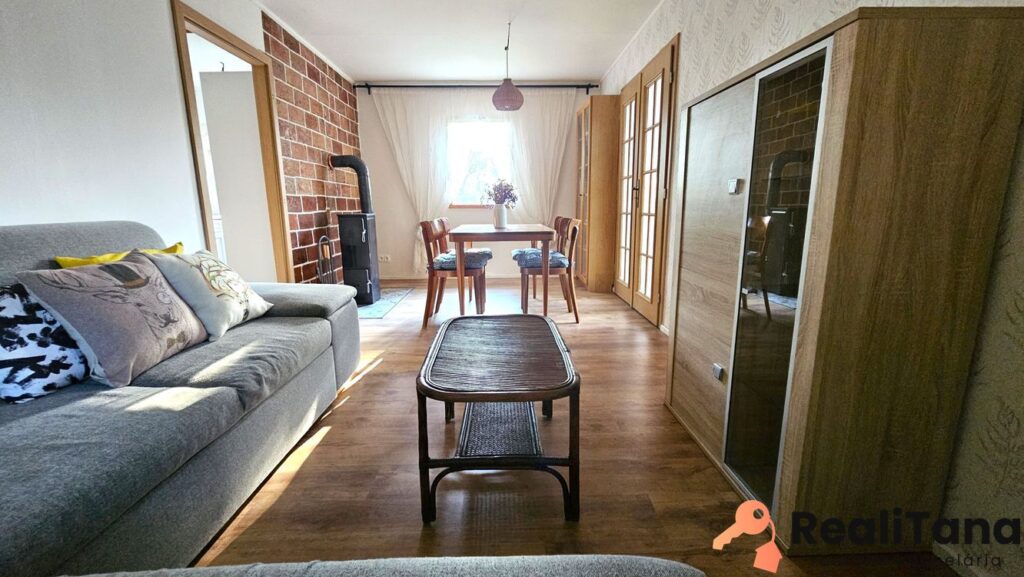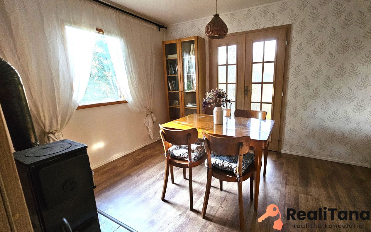 – poschodie: presklená veranda, chodba, kúpeľňa s WC, sprchovým kútom a bojlerom, spálňa, kuchyňa (el.rúra, mikrovlnka, chladnička), obývacia izba s kachlami